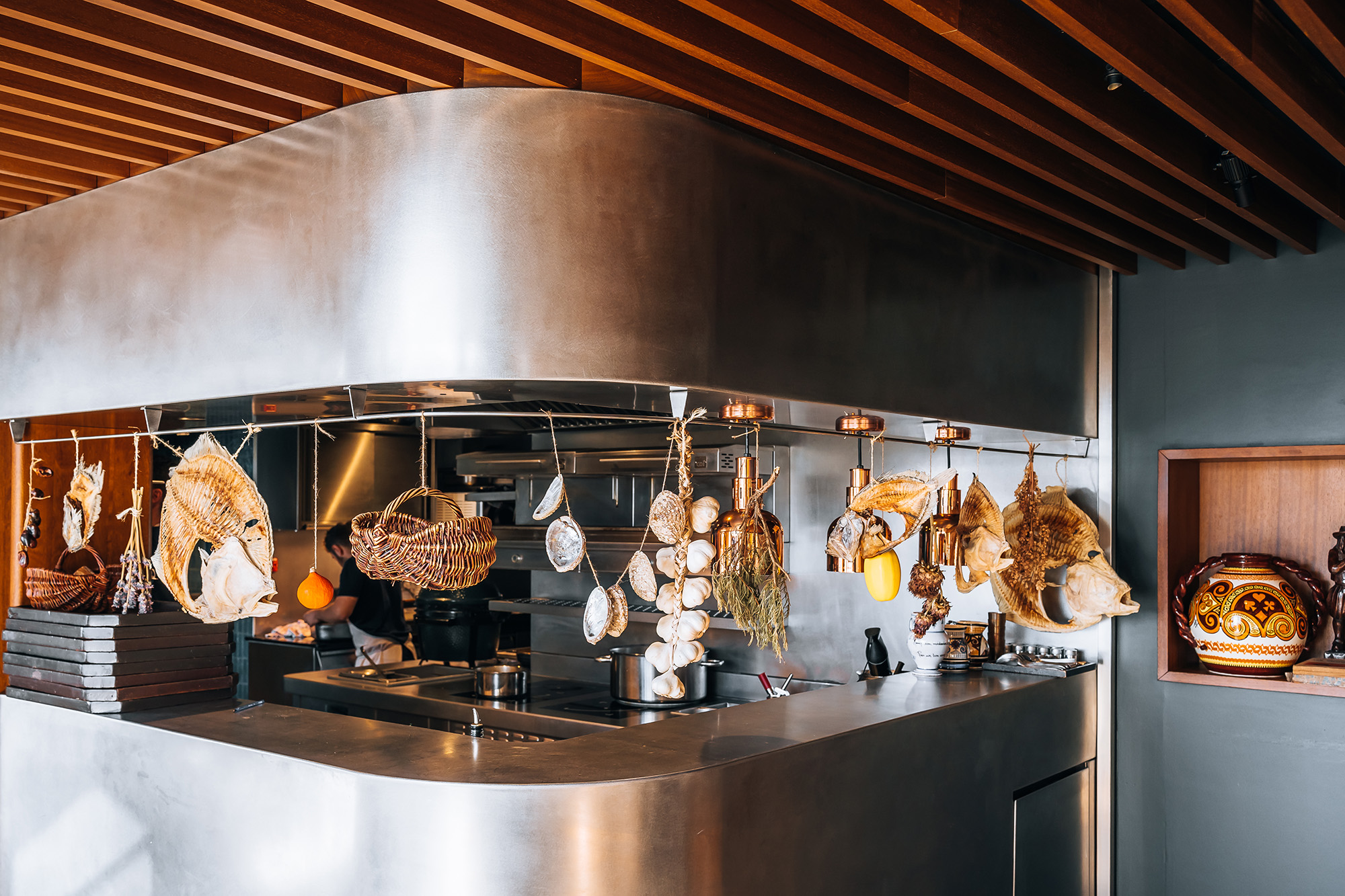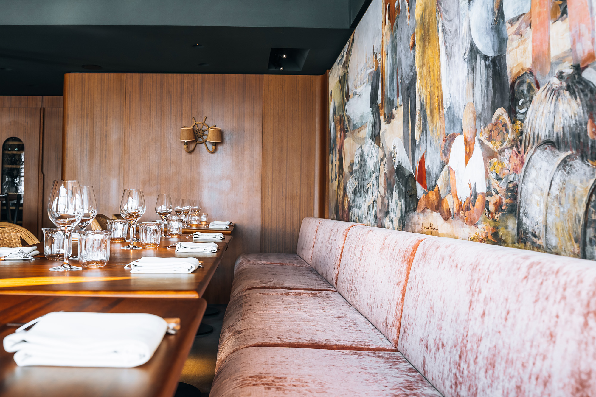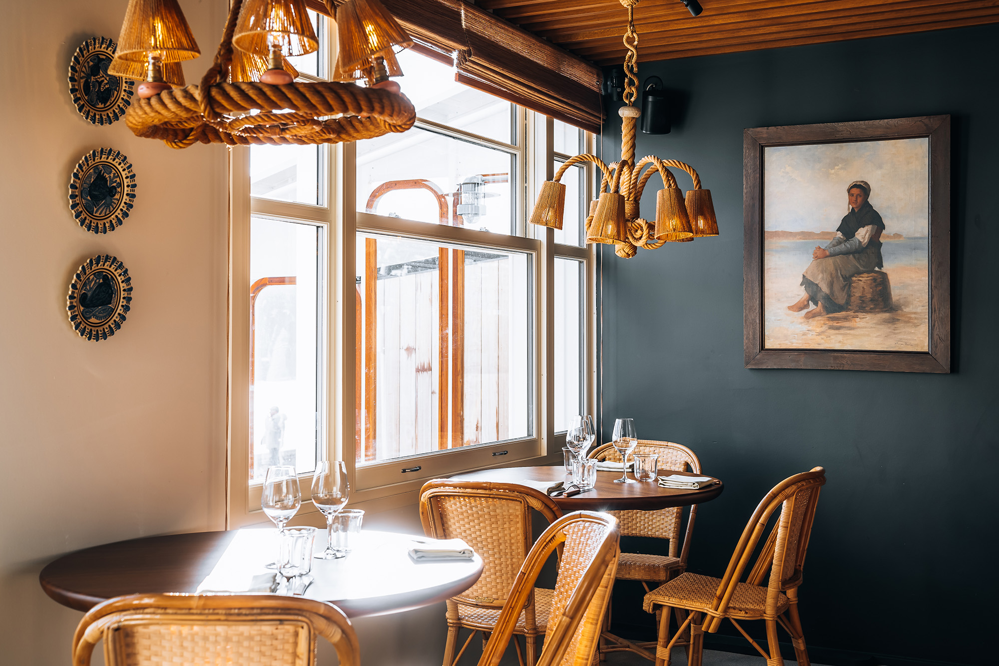 Dans le restaurant bistronomique L’Haliotis offrant une vue une vue panoramique sur la Baie de Trestraou à Perros-Guirec, notre équipe d’architectes a imaginé une décoration mêlant modernisme, artisanat breton et des références au mouvement artistique Seiz Breur.